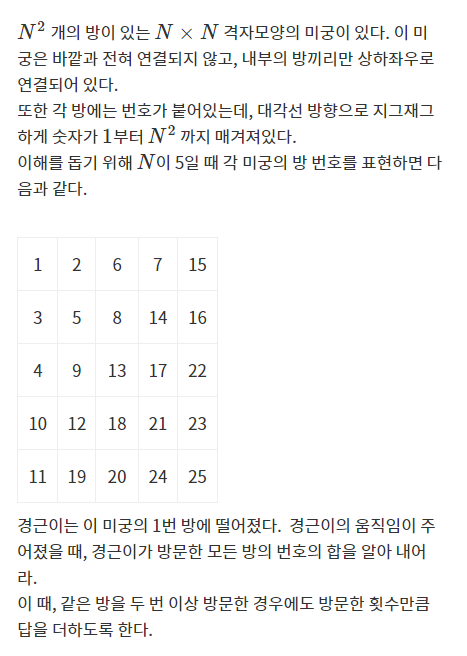 이 문제의 핵심은, 미궁의 각 방에 적힌 수를 알아내는 것이다. 미궁을 N by N 배열 array 라 했을때, array[i][j] 가 무었인지 상수시간 혹은 log(N) 이내에 알아내야 한다. 미궁의 각 방은 대각선순서로 값이 정해지므로, 규칙은 분명 대각선을 바라보면 찾을 수 있을 것이다.
