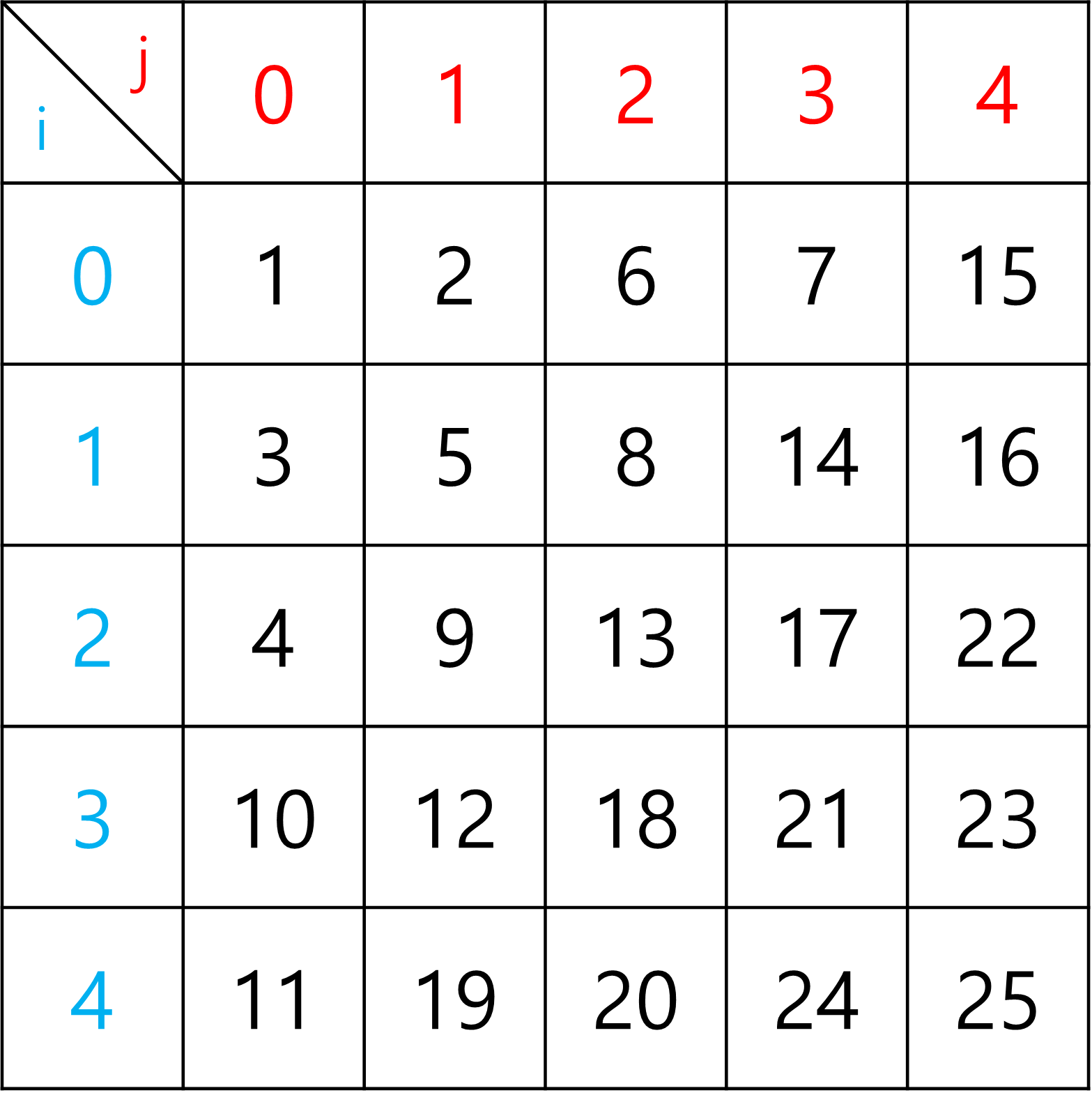 i + j <= N - 1 인 경우, 각 array[i][j]는 sigma(i + j) < array[i][j] <=sigma(i + j +1) 을 만족한다. 또한, i + j 가 1 씩 커질때마다, 각 라인에서 값이 커지는 방향이 반대로 바뀐다. 즉, 다음과 같은 로직이 성립한다.